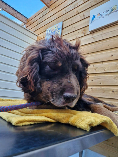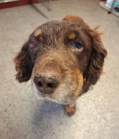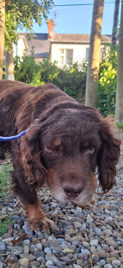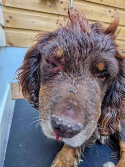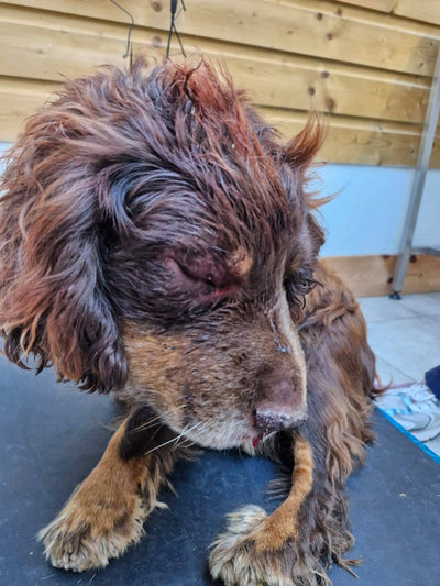 A couple of weeks ago a member of staff was driving home when she came across a dog staggering along a busy road near Laurencetown, Ballinasloe. He was very distressed and had injuries to his head face and eye. She pulled over, caught him and drove him the 50 minutes to our vets not knowing whether he was going to make the journey or not. This poor boy was in a bad way not just because of his injuries that were visible but he was struggling to stand, was dehydrated, flat and showed zero interest in anything going on around him. His face and head were also extremely bloated. His coat was filthy and matted. He was immediately given pain relief and put on a drip.