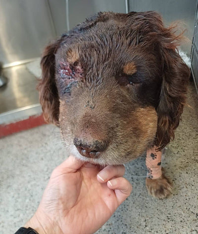 The next day Cognac had a more through examination and the extend of his injuries soon became apparent. He had many puncture wounds across his head. His eye socket was ruptured and his cheekbone fractured and possibly the side of his jaw. The swelling was due to cellulitis, where severe infection had set in and, his ears were full of fly eggs. Thankfully, there were no broken bones in his legs. Physically he was a mess but mentally this beautiful boy was struggling too. We named him Cognac and awaited news daily from the vet.