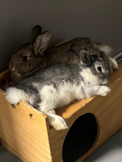 Rabbits can live in homes with other animals, but Clover and Flower would need to be kept separate from dogs and cats unless very closely supervised. Even the calmest dog can become overstimulated by a zoomie-filled bunny duo who will absolutely test boundaries!!