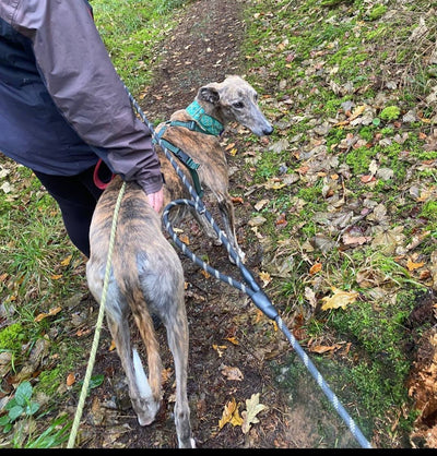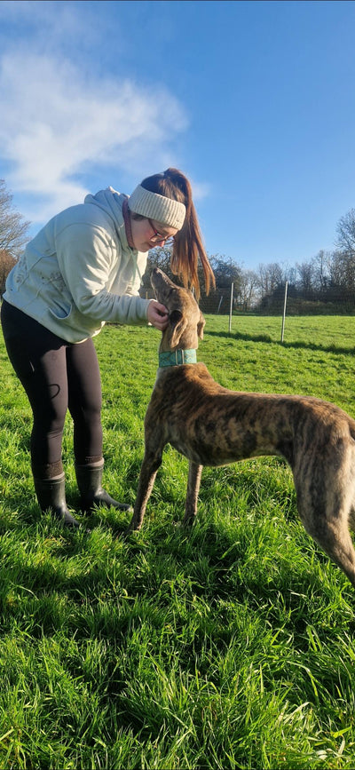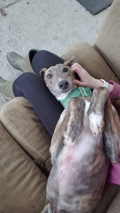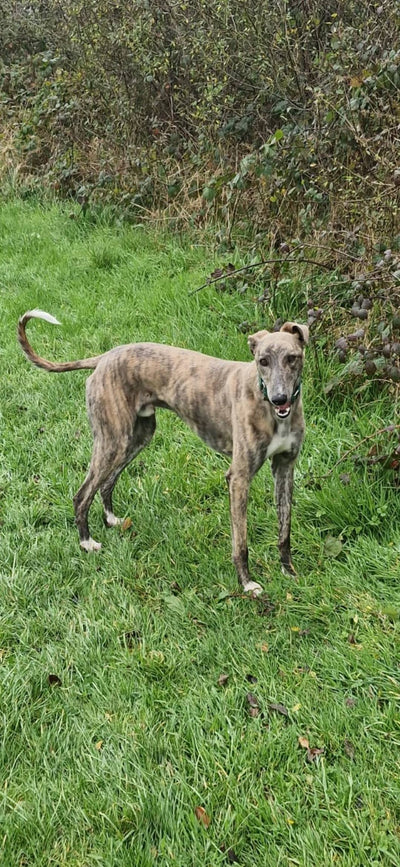 Moloney walks with a group of dogs including terriers, beaglesand collies and they all love their big, leggy friend and he loves them. Moloney, in typical lurcher style, loves a good chill on our sofa, better again if the human doesn't mind him lounging across their lap and ear rubs are available! He also loves a good gallop around our fields so it is important that he has access to a secure garden or a local secure field where he can stretch those long legs of his.