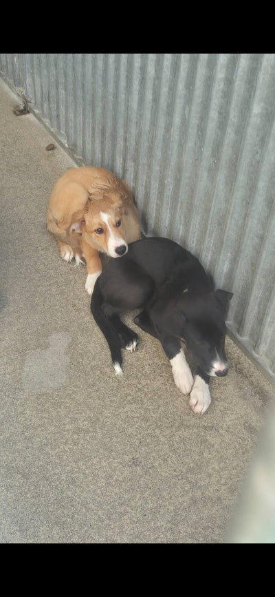 Two 4 month old pups arrived up our driveway in the boot of a car as "dumped puppies" despite the fact that we were already overwhelmed with adult dogs and 3 different litters of abandoned sick puppies. These two pups were terrified and showed all the signs of having little handling or socialisation. Pups like these are often referred to as "shed dogs" or "back yard dogs". Just starting to grow out of that first "cute" puppy stage and so are harder to sell or move on for whoever they really did belong too.